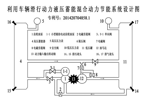 一、一種利用車輛滑行動力液壓蓄能混合動力節(jié)能系統(tǒng)工作原理 (專利號:201420704858.1)