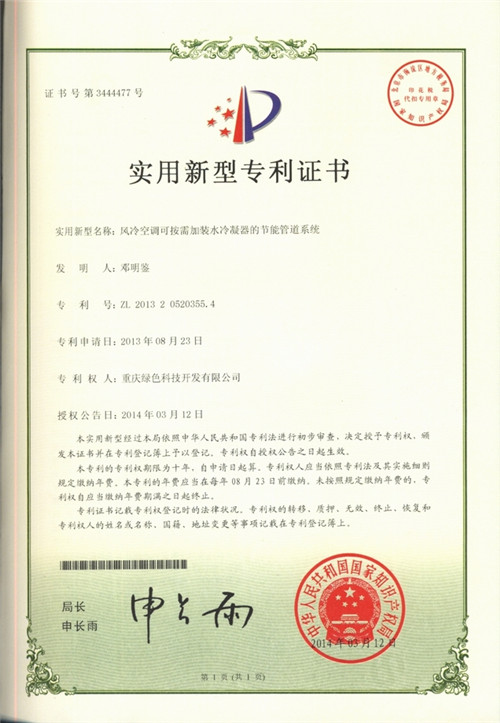 此專利技術(shù)由于在傳統(tǒng)風(fēng)冷空調(diào)中任意加裝水冷冷凝器節(jié)能管道系統(tǒng),因而適應(yīng)性強,拆裝方便,可提高制冷制熱功率30%,同時降低工作電流30%左右。工作原理:通過風(fēng)冷冷凝及水冷冷凝形成雙級冷凝的冷凝結(jié)構(gòu),能有效解決傳統(tǒng)風(fēng)冷空調(diào)單一采用風(fēng)冷冷凝方式導(dǎo)致冷凝壓力高、制冷劑溫度高、壓縮機負(fù)荷較重、溫度高、磨損大、噪聲大、能耗高、制冷效率低的問題。