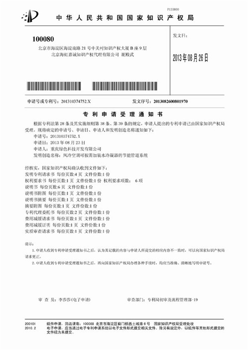 3. 風(fēng)冷空調(diào)可按需加裝水冷凝器的節(jié)能管道系統(tǒng)《專利申請受理通知書》(實用新型專利)復(fù)印件